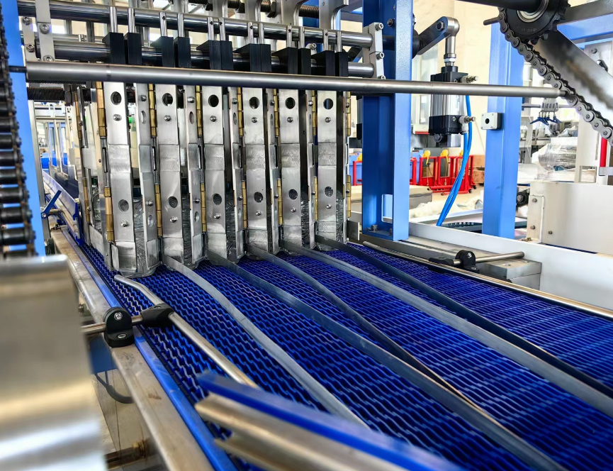 2、對國內(nèi)瓶型尺寸誤差較大這一實(shí)際情況,為防止被包裝物向前輸送當(dāng)中出現(xiàn)的倒瓶現(xiàn)象的發(fā)生,本公司生產(chǎn)的全自動熱收縮薄膜包裝機(jī)在推瓶機(jī)構(gòu)上專門設(shè)置了自動離合、光電停機(jī)裝置,復(fù)位快捷,可在一分鐘內(nèi)復(fù)位完畢,避免了由于倒瓶而可能造成的頻繁停機(jī)。