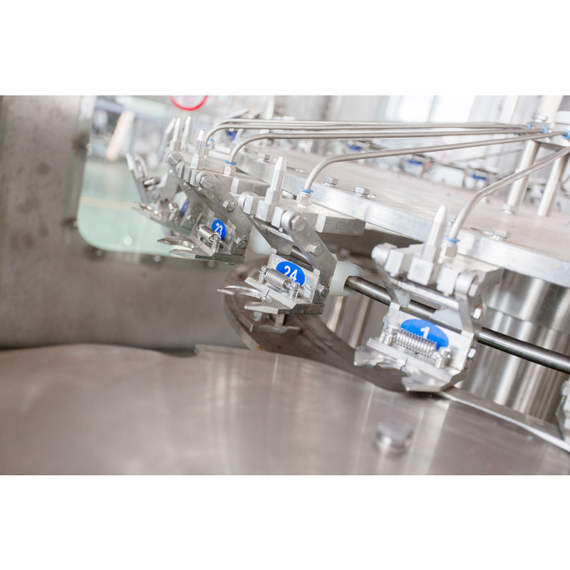 XGF24-24-6三合一灌裝機(jī)主要用于礦泉水、純凈水的灌裝作業(yè)。本機(jī)將沖洗、灌裝、旋蓋三功能合在一個(gè)機(jī)體上,全過(guò)程實(shí)現(xiàn)自動(dòng)化。適用于聚酯瓶、塑料瓶,各部分的適用瓶型調(diào)整采用手柄轉(zhuǎn)動(dòng)實(shí)現(xiàn),輕松自如,簡(jiǎn)便快捷。灌裝方式采用了新型的常壓灌裝,使灌裝速度更快更穩(wěn)定,所以與同規(guī)格的機(jī)器相比本機(jī)的產(chǎn) 量更高,效益更大。本機(jī)采用了先進(jìn)的可編程控制器(PLC)控制機(jī)器的自動(dòng)運(yùn)行,進(jìn)瓶鏈道采用變頻器調(diào)整,與主機(jī)變頻器相互配合使進(jìn)瓶運(yùn)行更穩(wěn)定可靠,光電檢測(cè)各部件的運(yùn)行狀況。自動(dòng)化程度高,操作簡(jiǎn)便。是礦泉水、純凈水生產(chǎn)廠家理想的首先設(shè)備。